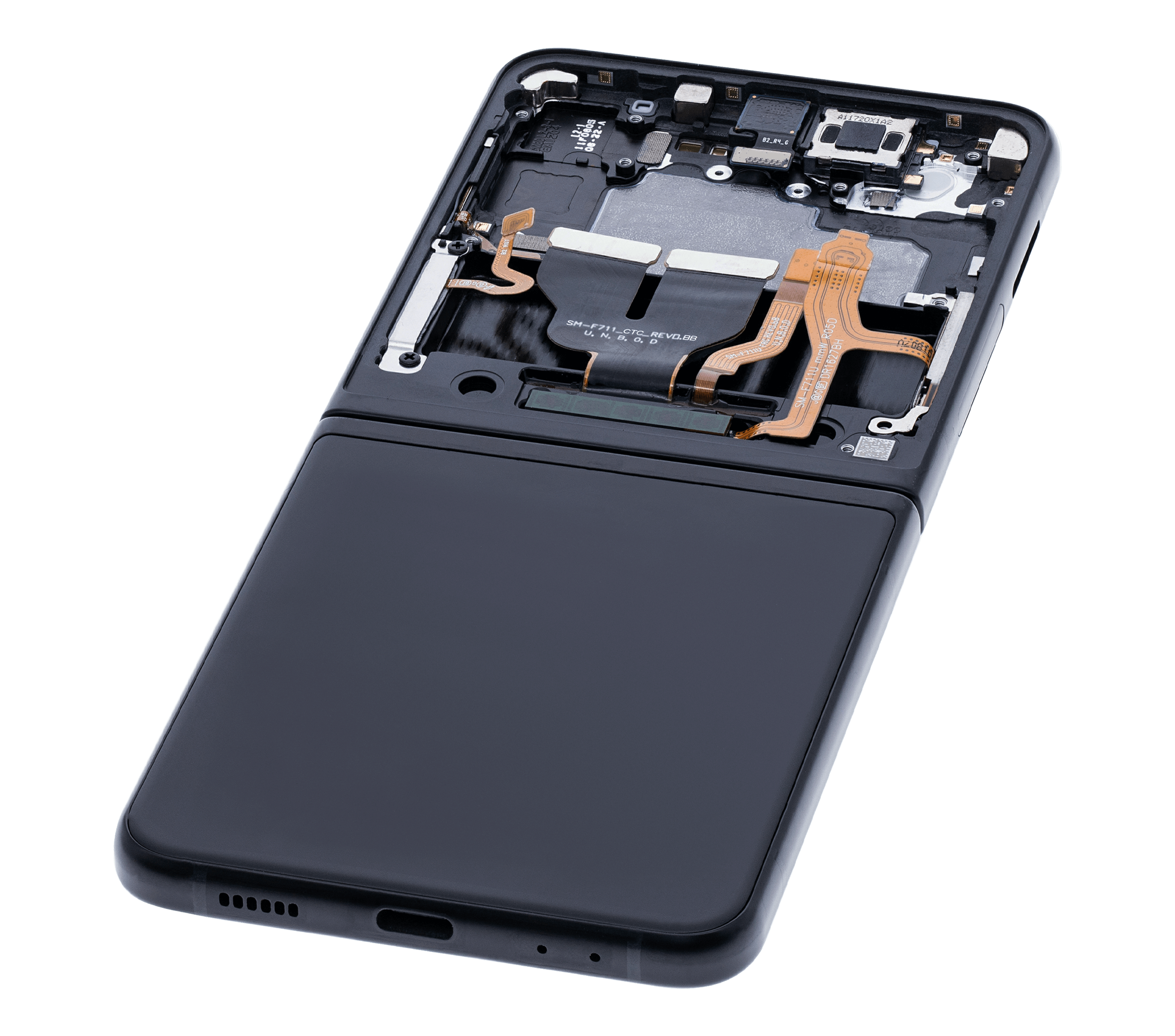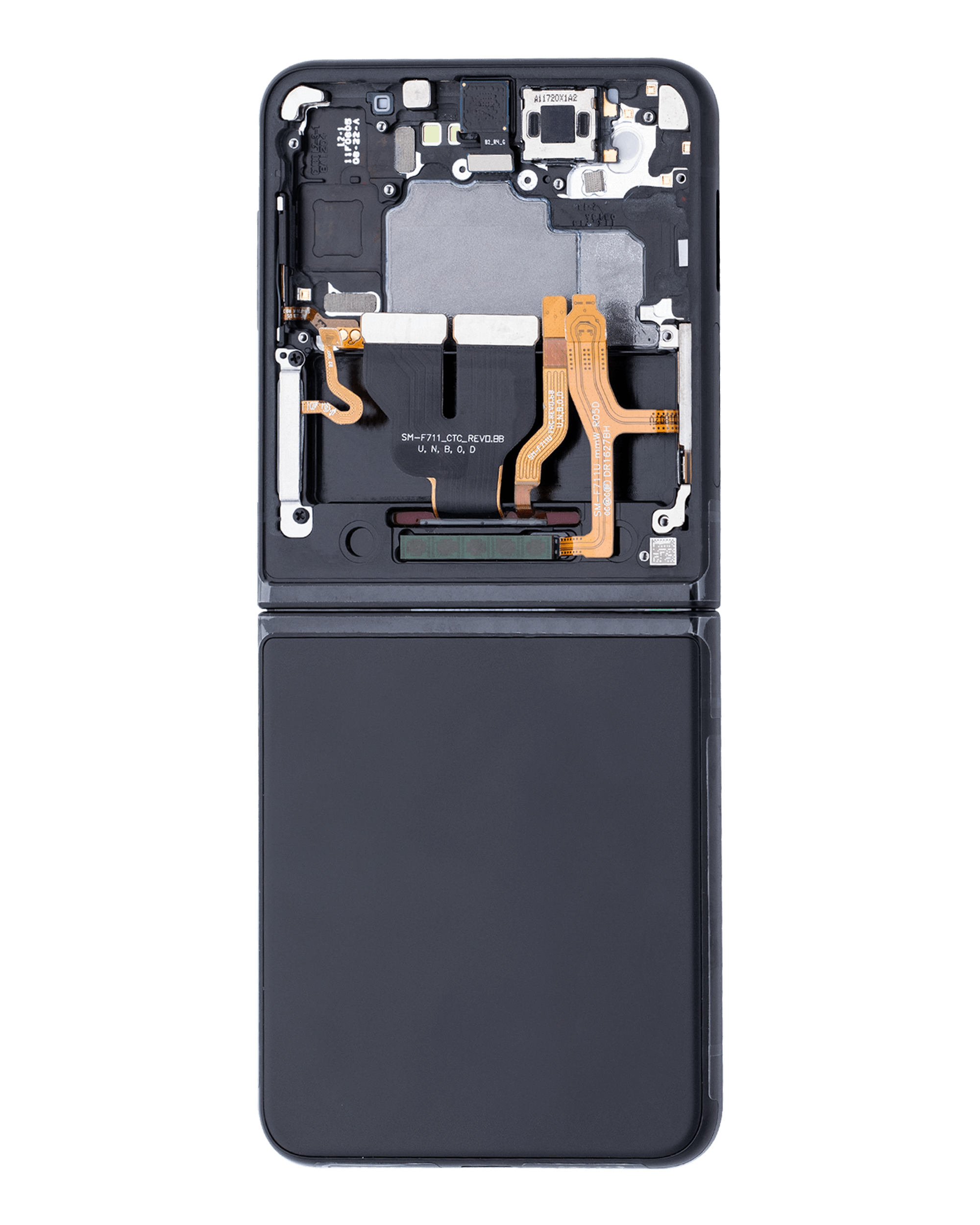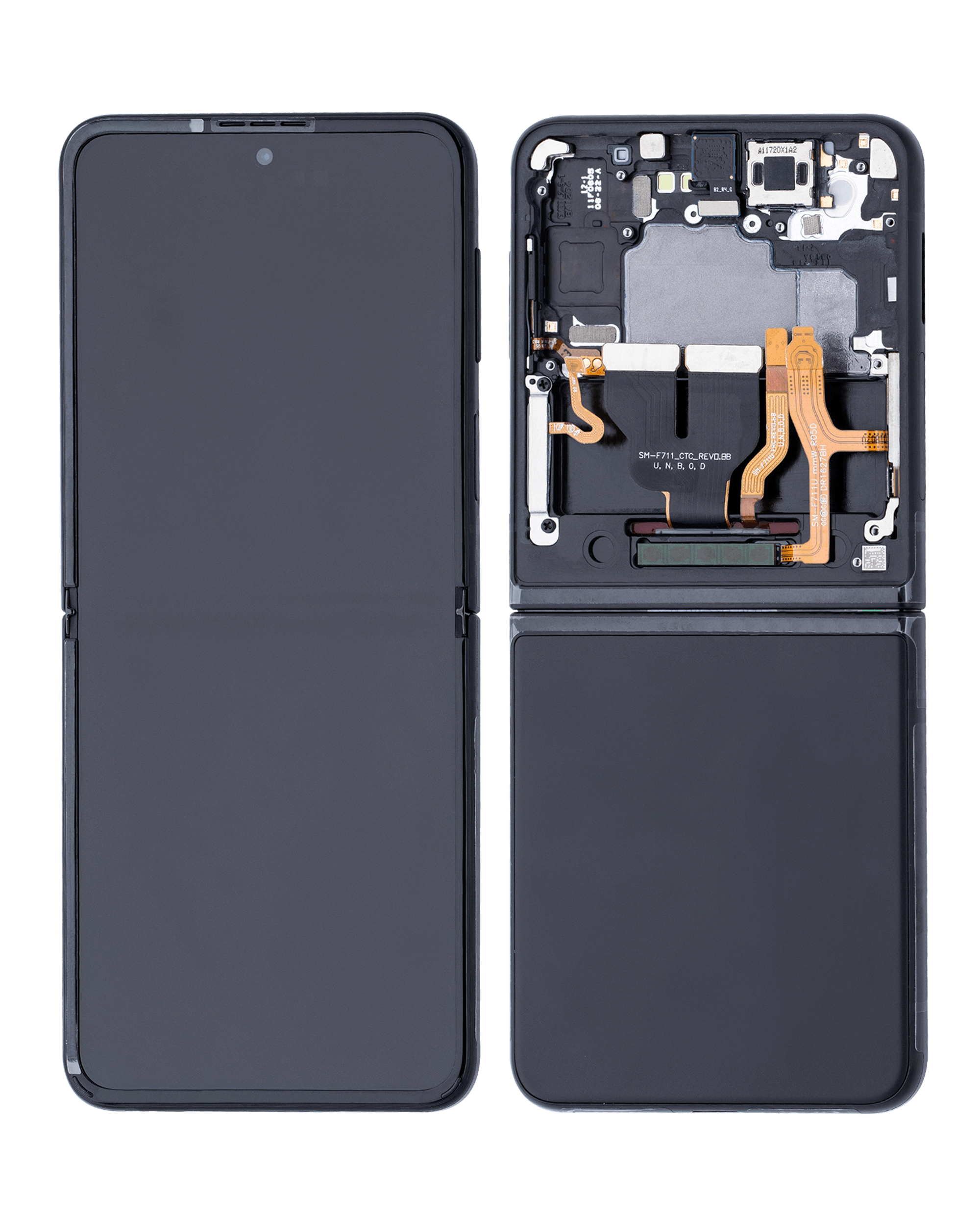 • High quality Samsung Galaxy Z Flip 3 5G inner OLED screen replacement with frame (US & International) (Used OEM Pull: Grade B/C) (Phantom Black).