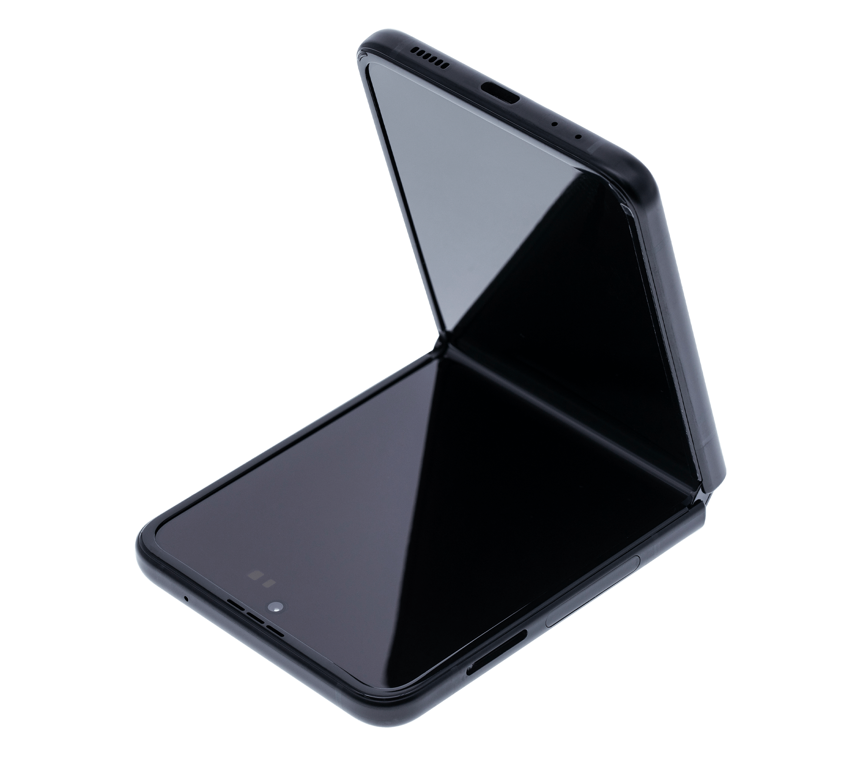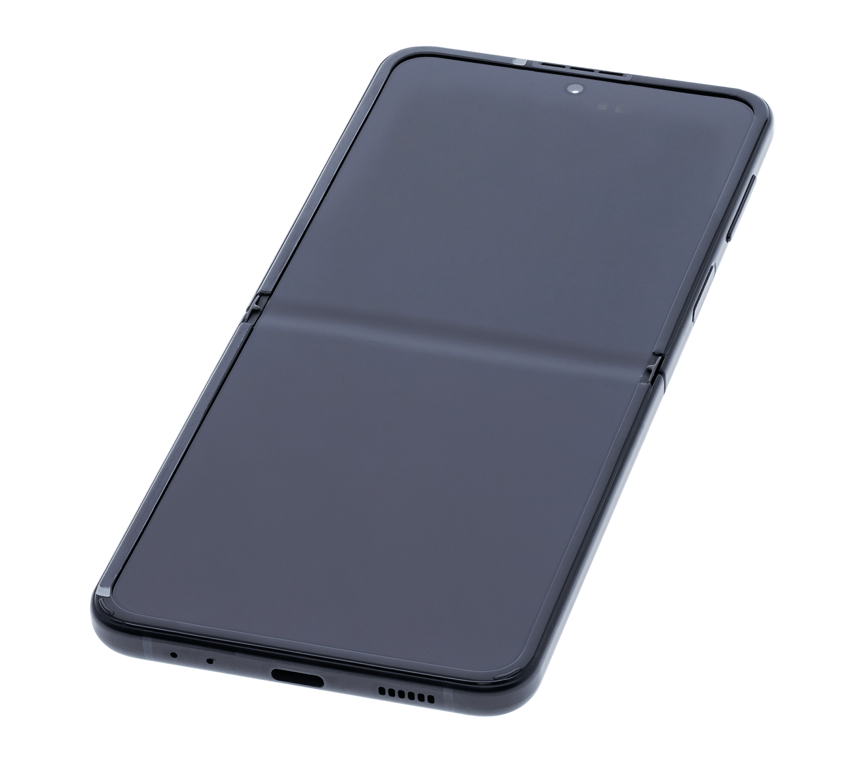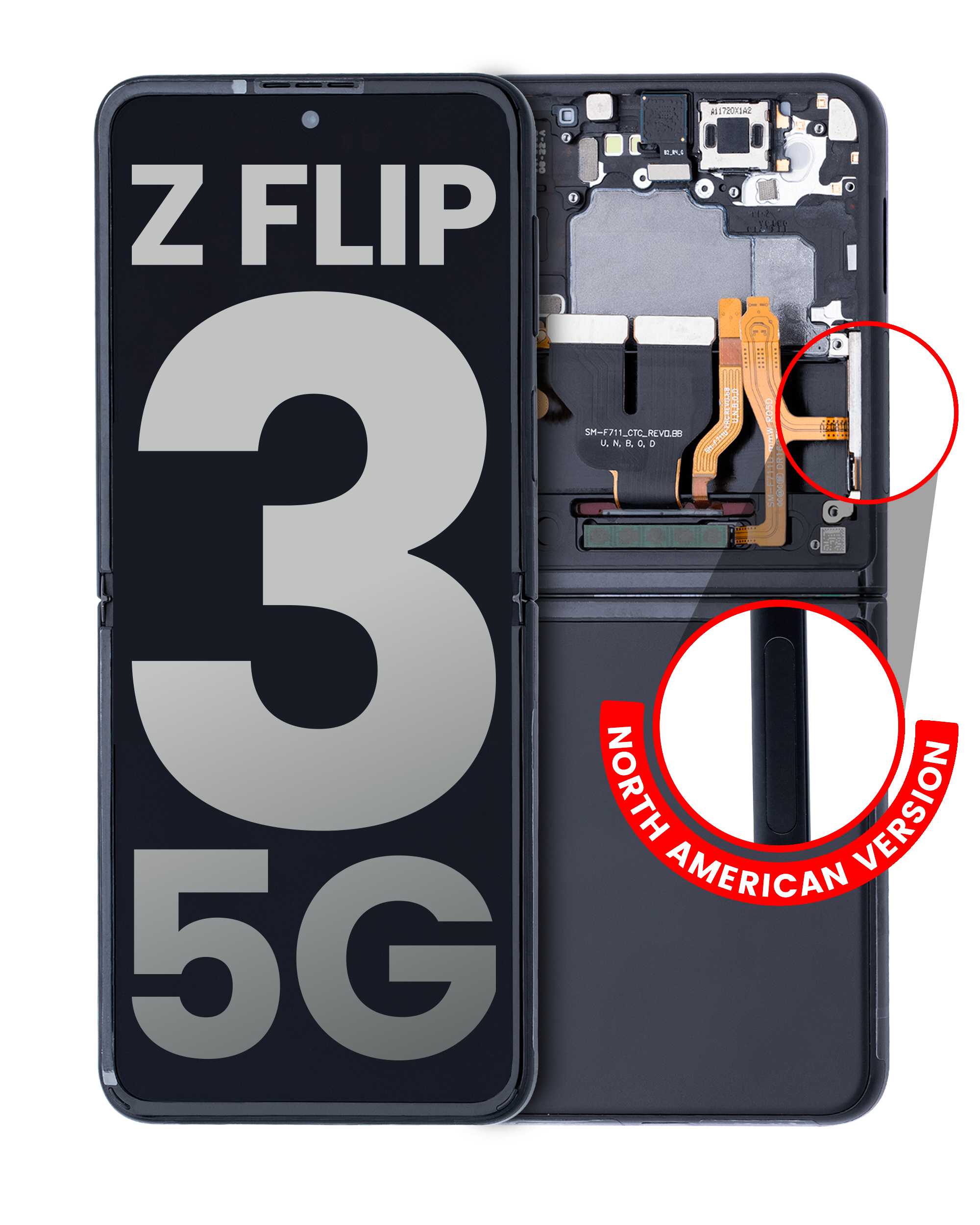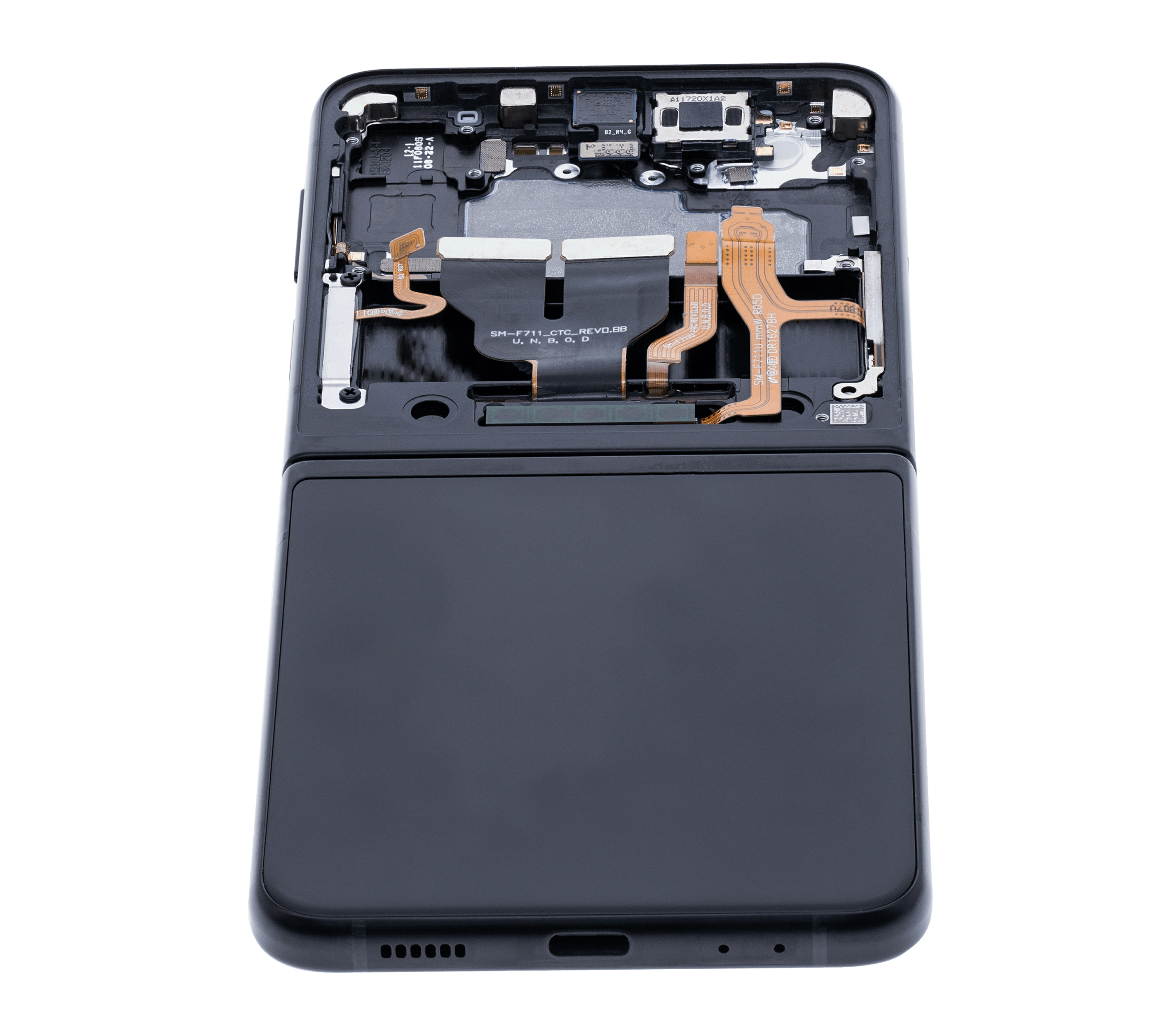 • High quality Samsung Galaxy Z Flip 3 5G inner OLED screen replacement with frame (US & International) (Used OEM Pull: Grade B/C) (Phantom Black).