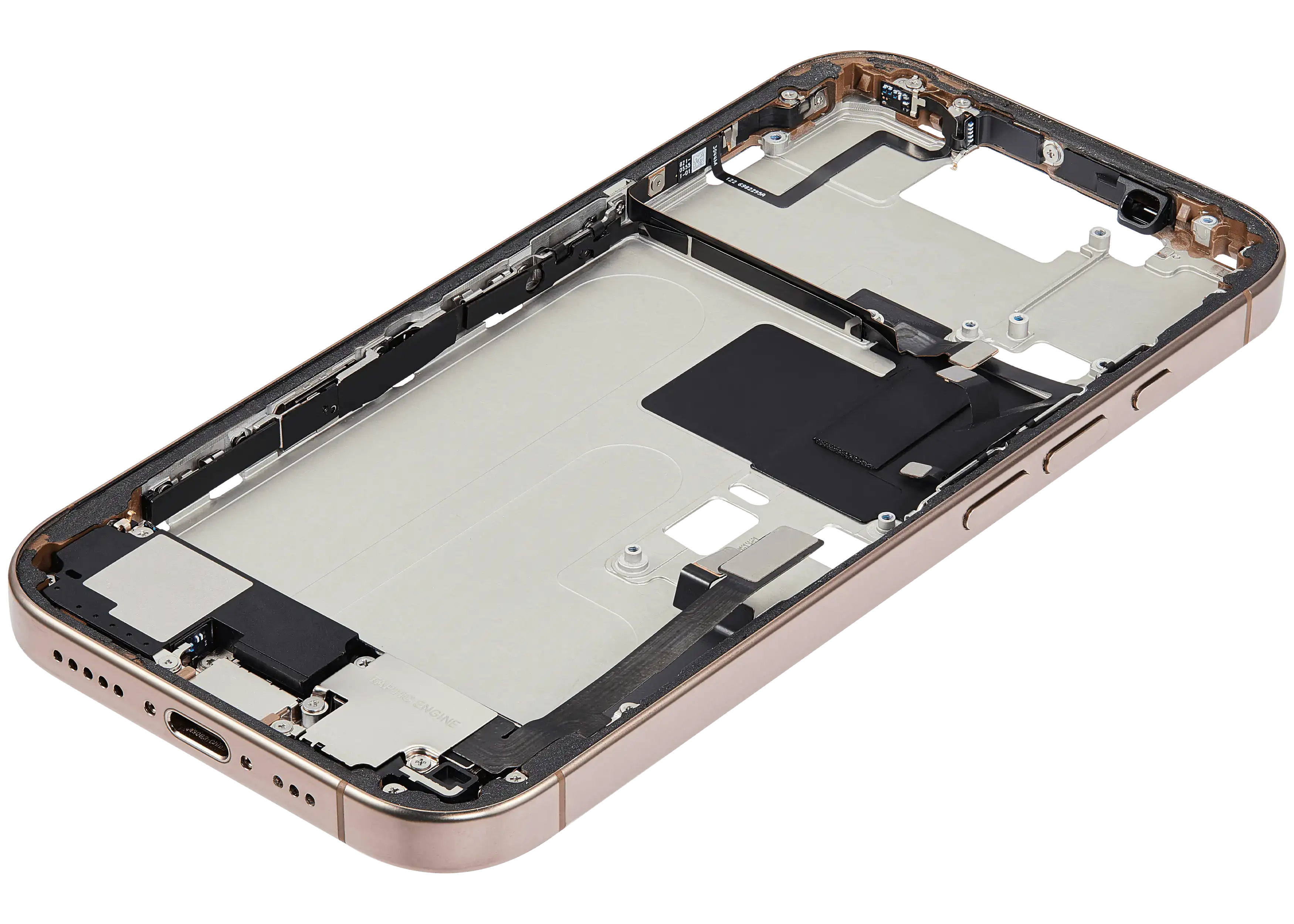 Mid-Frame Housing W/ Charging Port Flex & Small Parts For iPhone 16 Pro (US Version) (Used OEM Pull: Grade A) (Desert Titanium)